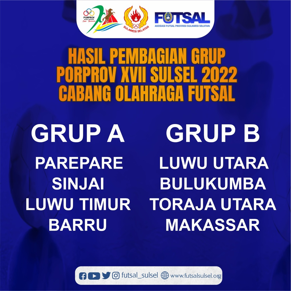 Berikut pembagian Grup Porprov XVII Sulsel Cabang Olahraga Futsal di Kabupaten Sinjai :