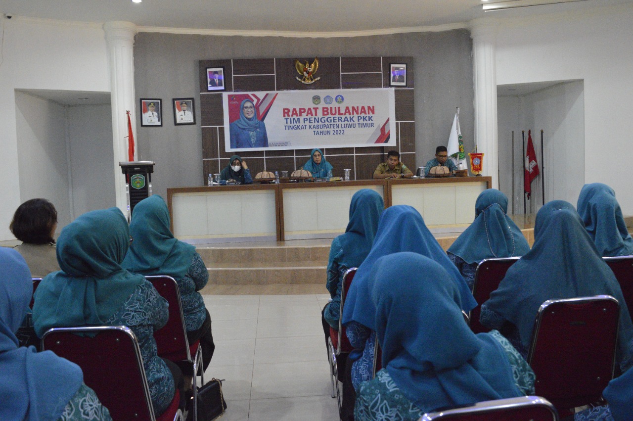 LUWU TIMUR – Ketua TP PKK Kabupaten Luwu Timur (Lutim), Hj. Sufriaty Budiman didampingi Ketua Bidang IV Kesehatan Keluarga dan Lingkungan, Hj. Masrah Bahri Suli, Kepala Bidang Kelembagaan dan Masyarakat Desa, Muzakkir, dan Staf Ahli TP PKK, Haeril Al-Fajri, memimpin rapat bulanan TP PKK Tingkat Kabupaten Lutim, di Aula Rujab Bupati Lutim, Senin (24/10/2022).