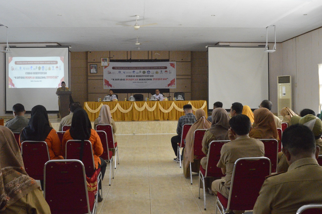 LUWU TIMUR – Asisten Perekonomian dan Pengembangan Infrastruktur, Masdin mewakili Bupati Luwu Timur didampingi Deputi Direktur Manajemen Strategis, EPK dan Kementrian Pemerintah Daerah, Bondan Kusuma, serta Kepala Sub Bagian EPK, Meilthon Purba, membuka secara resmi Sosialisasi Waspada Penipuan Berkedok Investasi bagi Aparatur Sipil Negara (ASN) Kabupaten Luwu Timur di Aula Dinas Pendidikan dan Kebudayaan, Selasa (08/11/2022).