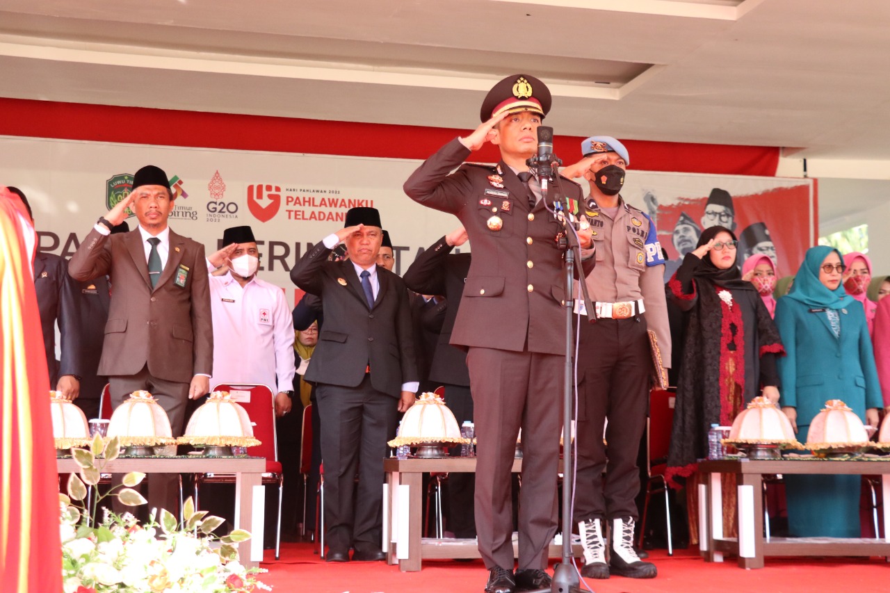 Kapolres mengatakan bahwa, teladan dari para Pahlawan Bangsa yang telah merasuk sukma, kiranya menjadi semangat kita di Peringatan Hari Pahlawan tahun ini, Pahlawanku Teladanku. Dengan semangat “Pulih Lebih Cepat, Bangkit Lebih Kuat”.