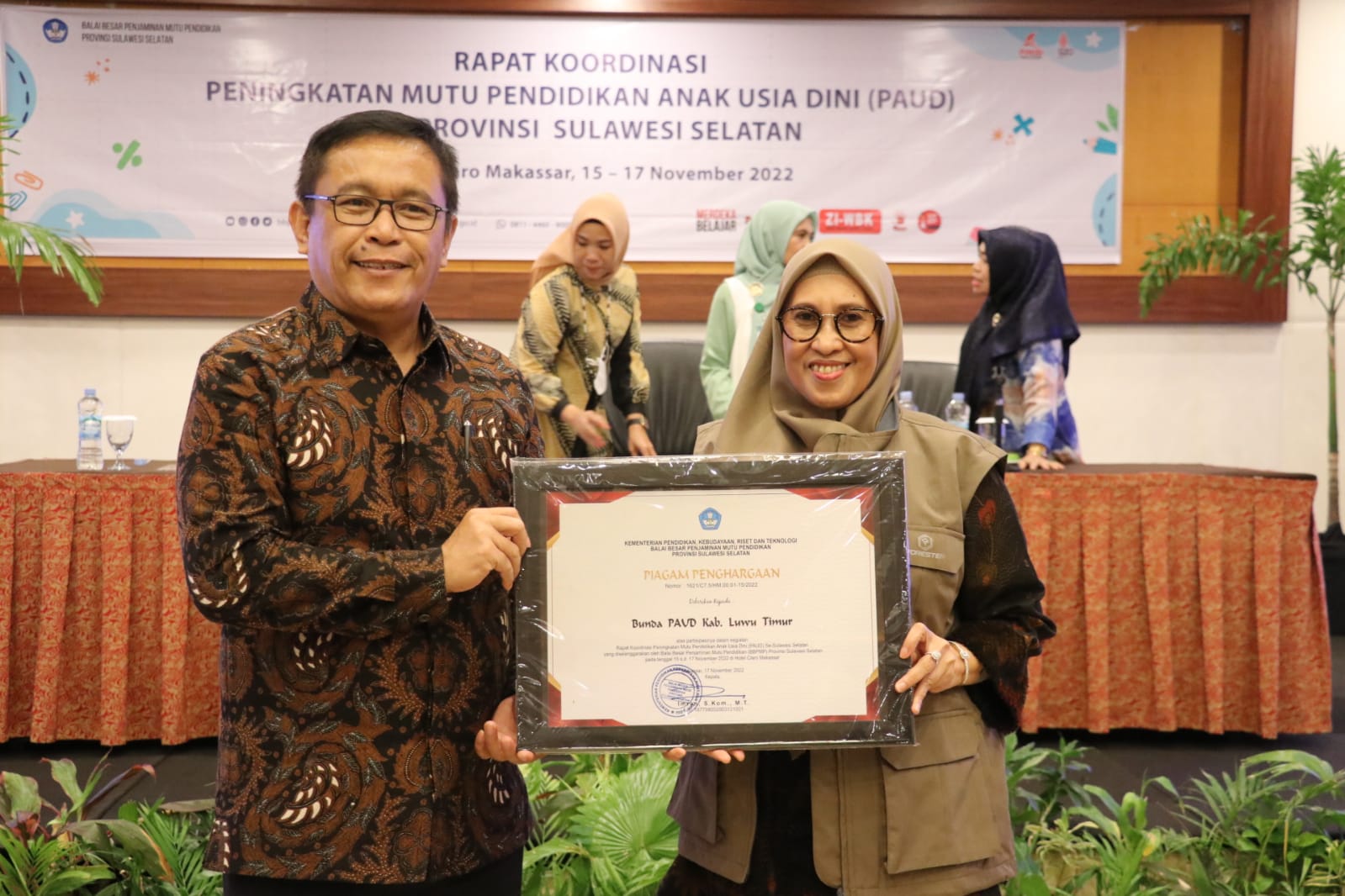 Penghargaan tersebut diserahkan oleh Ketua Forum PAUD Provinsi Sulsel, Prof. Dr. Arismunandar, M.Pd. pada hari kedua kegiatan Rapat Koordinasi (Rakor) Peningkatan Mutu Pendidikan Anak Usia Dini (PAUD) se-Sulawesi Selatan, di Hotel Claro Makassar, yang dihadiri pengurus PAUD Sulsel dan kabupaten/kota.