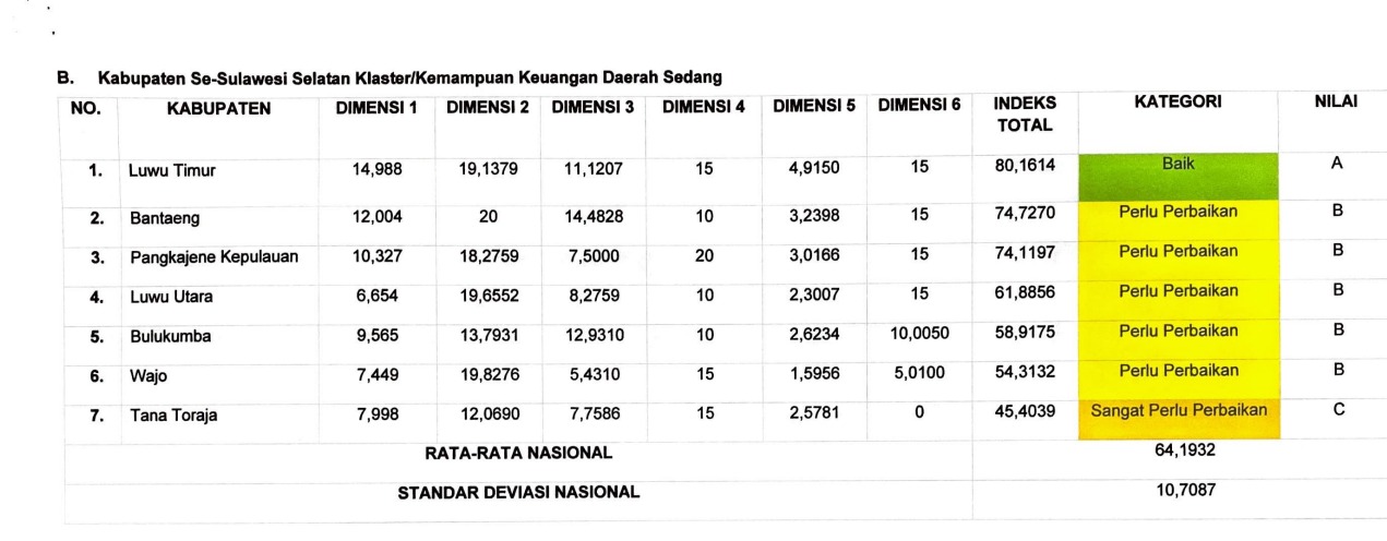 Hasil Pengukuran Indeks Pengelolaan Keuangan Daerah Kabupaten/Kota se-Provinsi Sulawesi Selatan TA. 2021 ini ditetapkan berdasarkan kemampuan keuangan daerah klaster rendah, sedang dan tinggi. Pada pengukuran IPKD ini, Luwu Timur berada di klaster sedang bersama enam Kabupaten/kota lainnya di Sulsel meliputi ; Bantaeng, Pangkep, Luwu Utara, Bulukumba, Wajo dan Tana Toraja, sesuai Peraturan Menteri Keuangan Nomor : 116/PMK.07/2021 Tentang Peta Kapasitas Fiskal Daerah yang membagi kab/kota dalam peta KFD dimana Luwu Timur tahun 2021 masuk dalam klaster sedang. Pada Klaster ini hanya Luwu Timur yang mendapat predikat terbaik dengan Nilai A.