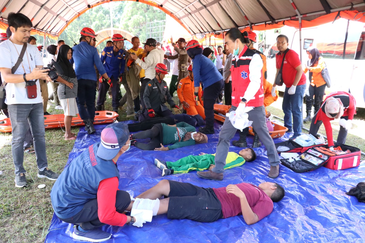 Kegiatan simulasi diawali saat masyarakat lagi bersantai dan anak-anak sekolah sedang menjalani proses belajar mengajar, tiba-tiba terjadilah gempa bumi yang membuat masyarakat beserta anak-anak sekolah panik dan berhamburan keluar ruangan.