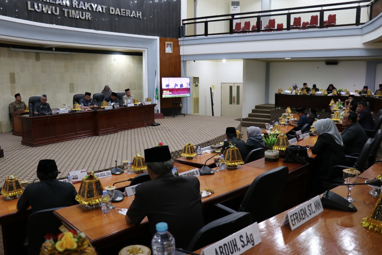 Paripurna yang berlangsung, Rabu (14/12/2022) tersebut, dipimpin langsung Ketua DPRD Lutim, Aripin, didampingi Wakil Ketua I dan II, HM. Siddiq BM. dan H. Usman Sadik. Turut hadir segenap Anggota DPRD, Asisten dan Staf Ahli, para Kepala OPD, para Kepala Bagian dan Camat.