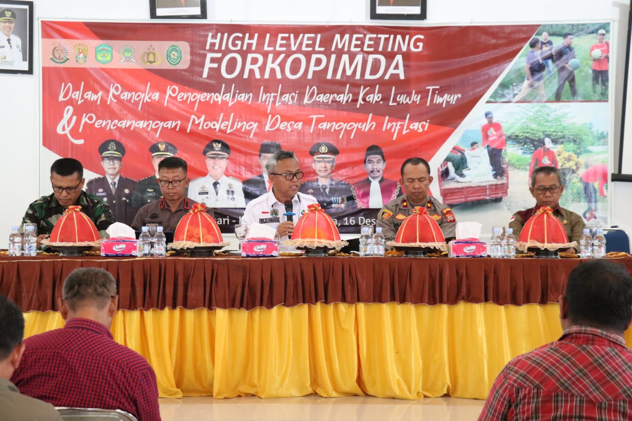 LUWU TIMUR – Bupati Luwu Timur, H. Budiman didampingi unsur Forkopimda dan Sekda Lutim, memimpin Rapat High Level Meeting yang dirangkaikan dengan Pencanangan Modeling Desa Tangguh Inflasi, di Kantor Desa Wanasari, Kecamatan Angkona, Jumat (16/12/2022).