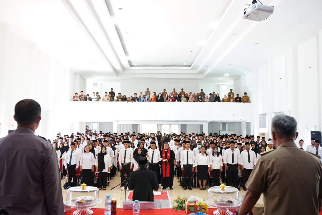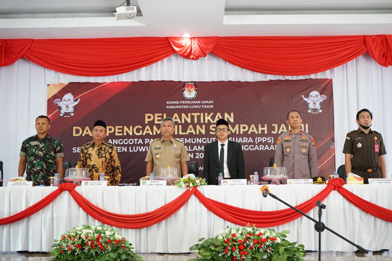 LUWU TIMUR – Bupati Luwu Timur (Lutim), H. Budiman bersama Wakil Ketua I DPRD Lutim, H.M. Siddiq, dan Forkopimda Lutim, menghadiri Pelantikan dan Pengambilan Sumpah Janji Anggota Panitia Pemungutan Suara (PPS) se – Lutim yang akan bertugas sebagai penyelenggara Pemilihan Umum (Pemilu) Tahun 2024, di Gedung Wanita Simpurusiang, Selasa (24/01/2023).