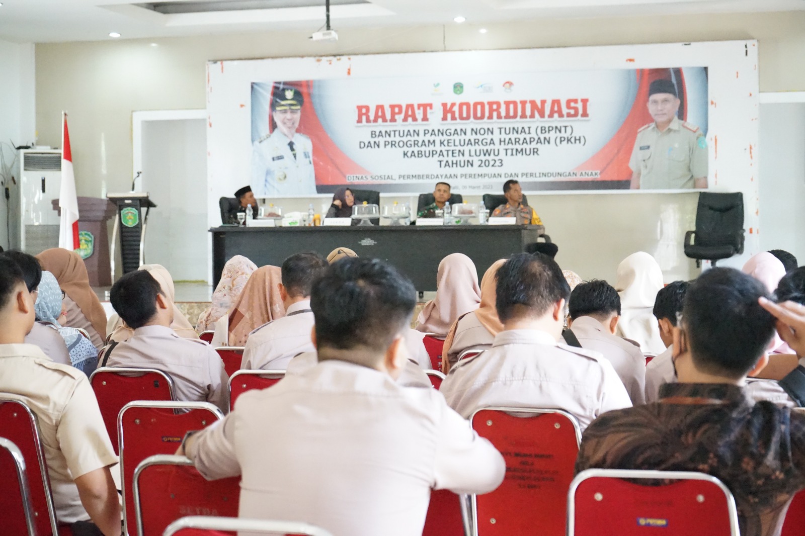 LUWU TIMUR – Asisten Pemerintah dan Kesejahteraan Rakyat (Kesra), Aini Endis Anrika didampingi Kepala Dinas Sosial, Pemberdayaan Perempuan dan Perlindungan Anak (P3A), Sukarti, Wakapolres sekaligus Ketua Satgas Bansos, serta Perwira Penghubung, memimpin Rapat Koordinasi (Rakor) Persiapan Penyaluran Bantuan Pangan Non Tunai (BPNT) dan Program Keluarga Harapan (PKH) Triwukan I Tahun 2023, di Gedung Wanita Simpurusiang, Kamis (09/03/2023).