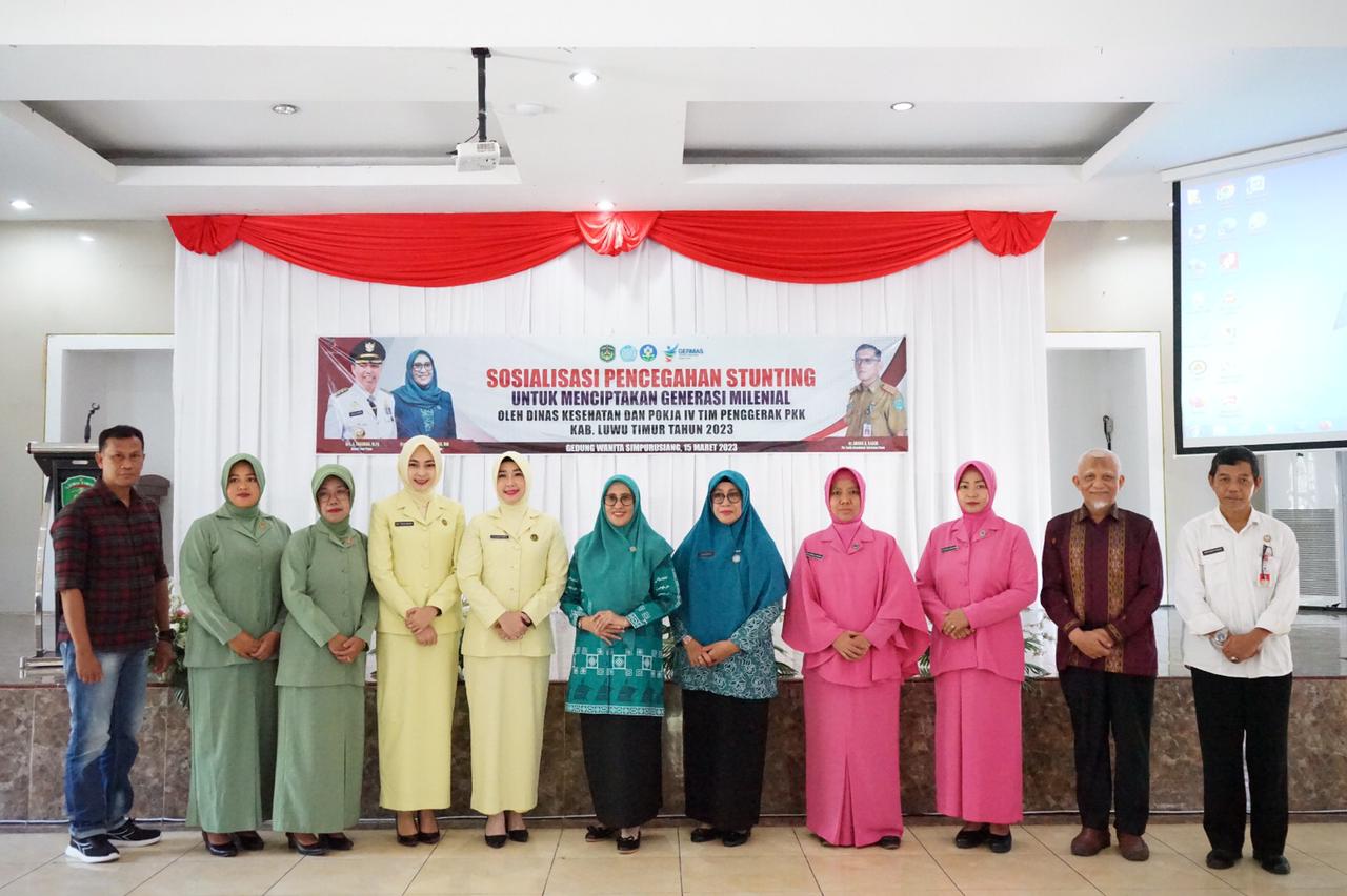 LUWU TIMUR – Pemerintah Kabupaten Luwu Timur melalui Dinas Kesehatan (Dinkes) bekerjasama dengan Pokja IV TP PKK Lutim Sosialisasi Pencegahan Stunting untuk menciptakan generasi millenial, di Gedung Wanita Simpurusiang Malili, Rabu (15/03/2023).