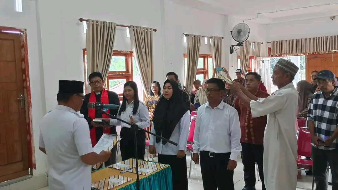 Camat Tomoni, Catur Dian Sintawati mengucapkan selamat kepada perangkat desa yang baru saja dilantik dan diambil sumpahnya.