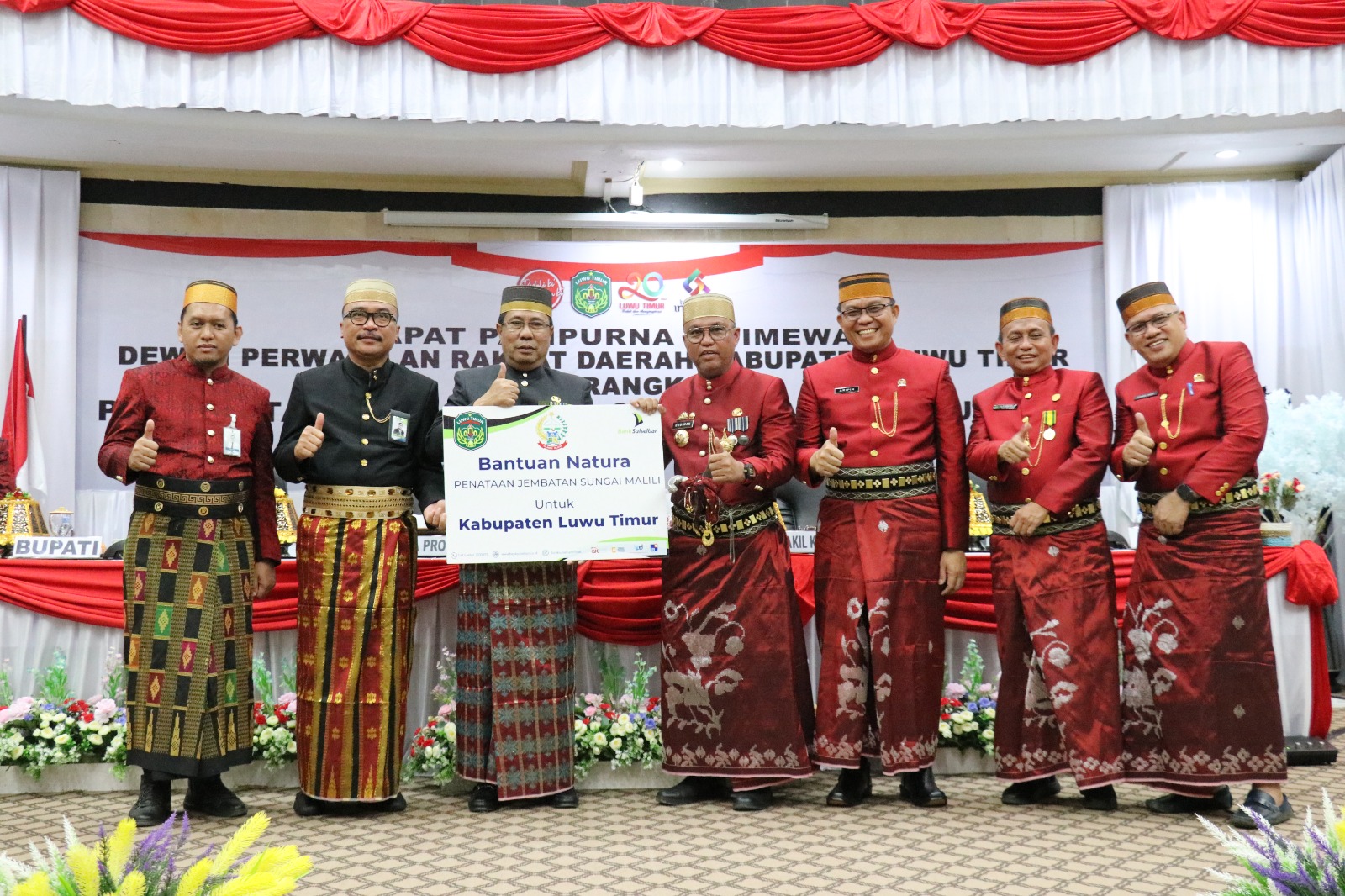 LUWU TIMUR – Bupati Luwu Timur, H. Budiman menerima bantuan natura penataan jembatan sungai Malili sekaligus melaunching E-Money yang diserahkan langsung oleh Sekretaris Daerah Provinsi Sulawesi Selatan, Andi Aslam Patonangi dan Direktur PT. Bank Sulselbar, H. Yulis Suandi pada peringatan Hari Ulang Tahun Ke 20 Kabupaten Luwu Timur, yang berlangsung dalam Rapat Paripurna Istimewa Dewan Perwakilan Rakyat Daerah Kabupaten Lutim dalam rangka Peringatan Hari Jadi Ke 20 Tahun Lutim dengan tema “Peduli dan Menginspirasi”, di Ruang Sidang DPRD, Rabu (03/05/2023).