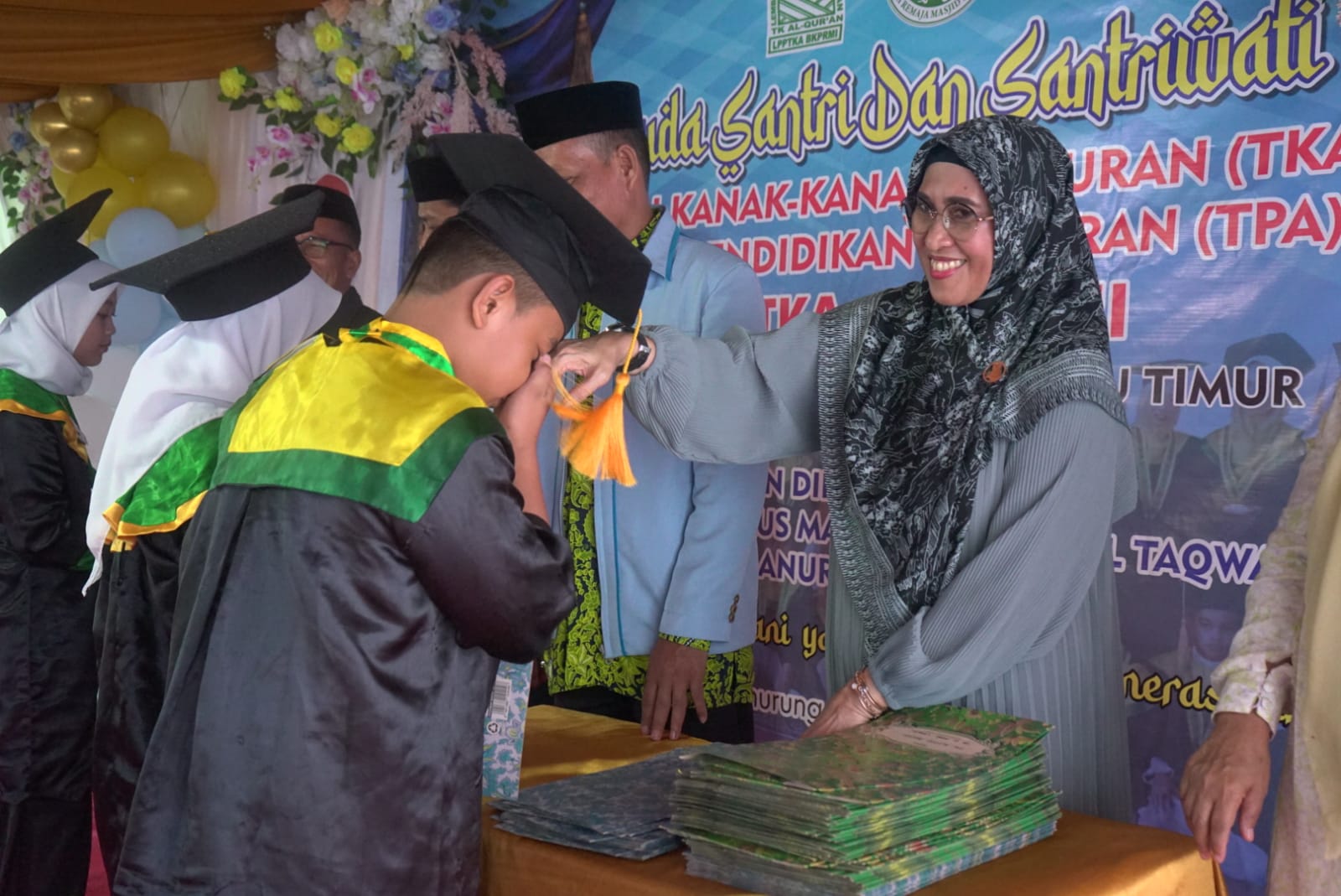 LUWU TIMUR – Ketua TP PKK Luwu Timur, Hj. Sufriaty menghadiri Wisuda Santri dan Santriwati Taman Kanak-Kanak Al-Qur-an (TKA), Taman Pendidikan Al-Qur’an (TPA) se-Kecamatan Malili Tahun 2023, dirangkaikan Pengukuhan Pengurus Masjid Jami Nurul Taqwa Pabeta, Desa Manurung, Minggu (18/06/2023). Kegiatan ini mengusung tema: “Mewujudkan Generasi Qurani Yang Gemilang dan Generasi Cinta Mesjid”.