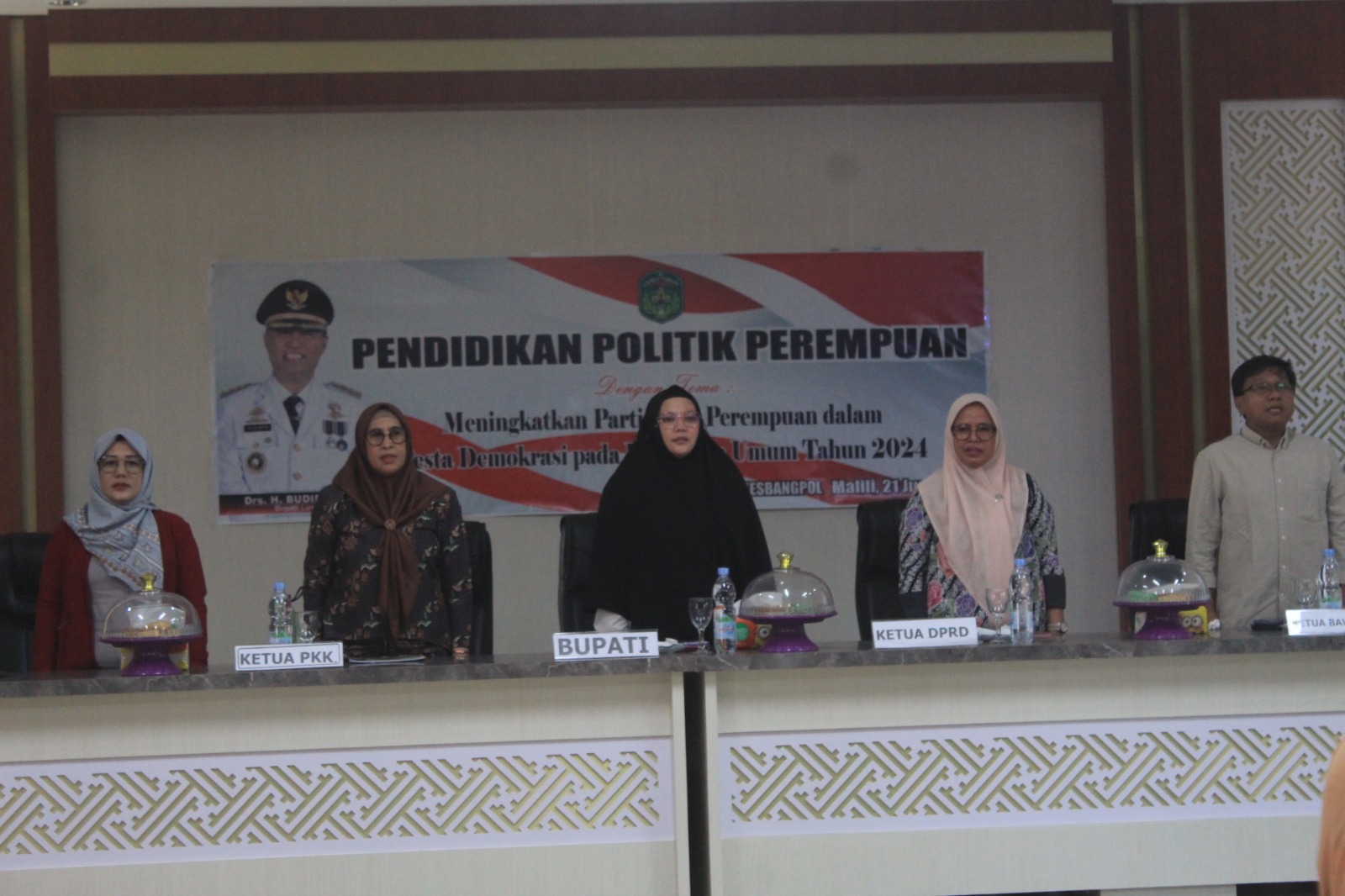 LUWU TIMUR – Asisten Pemerintahan dan Kesejahteraan Rakyat (Kesra), Aini Endis Anrika, mewakili Bupati Lutim, bersama Ketua Tim Penggerak PKK Luwu Timur (Lutim), Hj. Sufriaty Budiman Ketua Komisi I DPRD, Hj, Harisah, membuka kegiatan Pendidikan Politik Perempuan dengan tema “Meningkatkan Partisipasi Perempuan dalam Pesta Demokrasi pada Pemilihan Umum Tahun 2024”, di Aula Sasana Praja Kantor Bupati Lutim, Rabu (21/6/2023).
