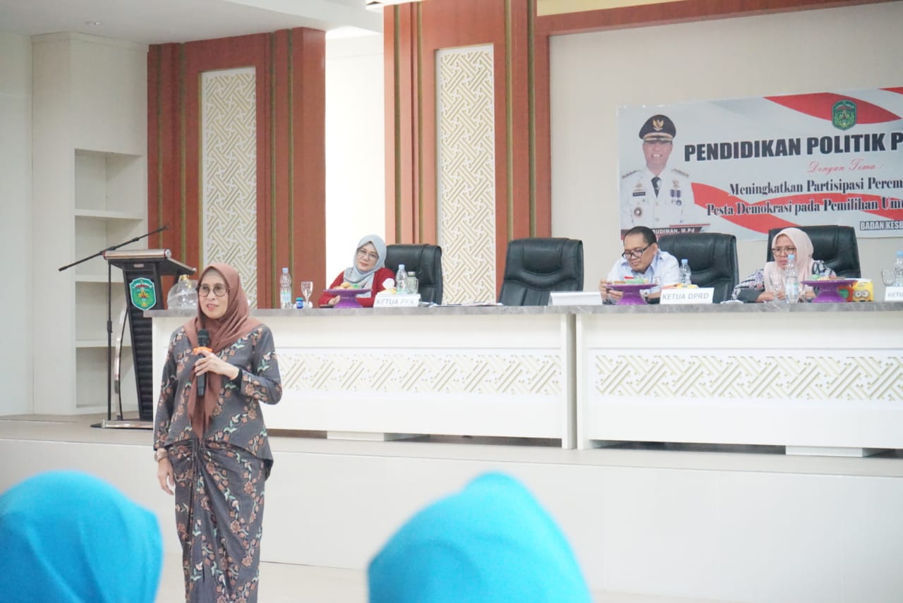LUWU TIMUR – Ketua Tim Penggerak (TP) PKK Luwu Timur (Lutim), Hj. Sufriaty Budiman memaparkan pentingnya peran perempuan untuk demokrasi yang kuat dan inklusif, saat menjadi narasumber pada kegiatan Pendidikan politik perempuan dengan tema “Meningkatkan Partisipasi Perempuan dalam Pesta Demokrasi pada Pemilihan Umum Tahun 2024” yang digelar Badan Kesatuan Bangsa dan Politik Kabupaten Lutim, di Aula Sasana Praja Kantor Bupati Lutim, Rabu (21/6/2023).