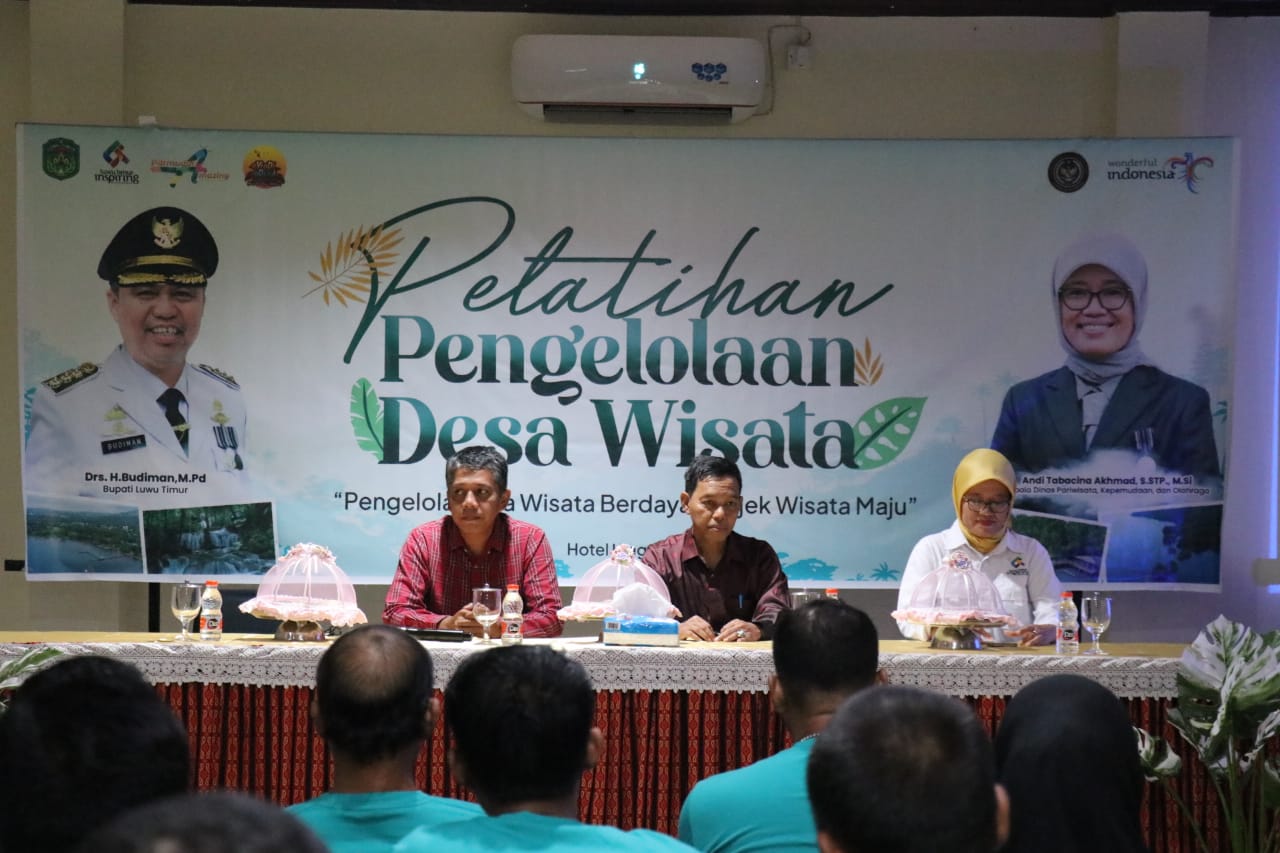 LUWU TIMUR – Dinas Pariwisata, Pemuda dan Olahraga Kabupaten Luwu Timur menggelar Pelatihan Pengelolaan Desa Wisata yang dibuka oleh Staf Ahli Bidang Pembangunan, Rapiuddin Tahir mewakili Bupati Luwu Timur, di Aula Hotel I Lagaligo Malili, Sabtu (24/06/2023) malam.