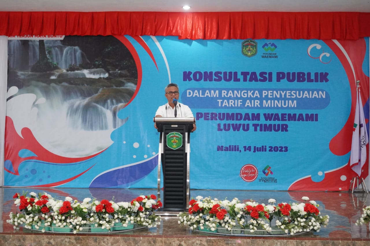LUWU TIMUR – Perusahaan Umum Daerah (Perumda) Waemami Kabupaten Luwu Timur melaksanakan Konsultasi Publik Rancangan Penyesuaian Tarif Air Minum Tahun 2023 Perumda Waemami Lutim, di Gedung Simpurusiang Malili, Jumat (14/07/2023).