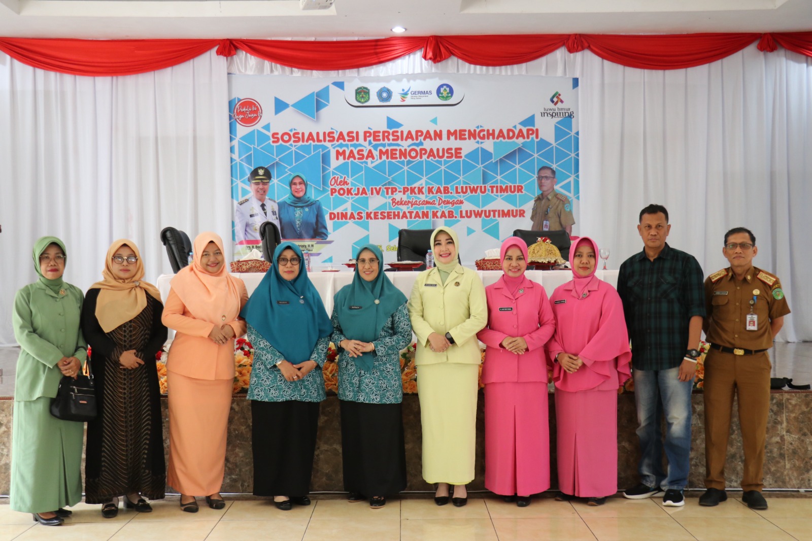LUWU TIMUR – Ketua Tim Penggerak (TP) PKK Kabupaten Luwu Timur (Lutim) , Hj. Sufriaty bersama Ketua Bidang IV TP PKK Lutim, Hj. Masrah Bahri Suli, membuka Sosialisasi Persiapan Menghadapi Masa Menopause, di Gedung Simpurusiang Malili, Selasa (25/7/2023).