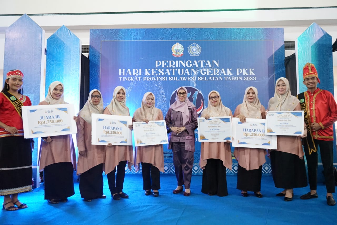 Dalam sambutannya, Ketua TP PKK Provinsi Sulsel, Naoemi Octarina mengucapkan selamat kepada para pemenang lomba HKG PKK mulai dari harapan III sampai juara I dan juga kepada juara umum.