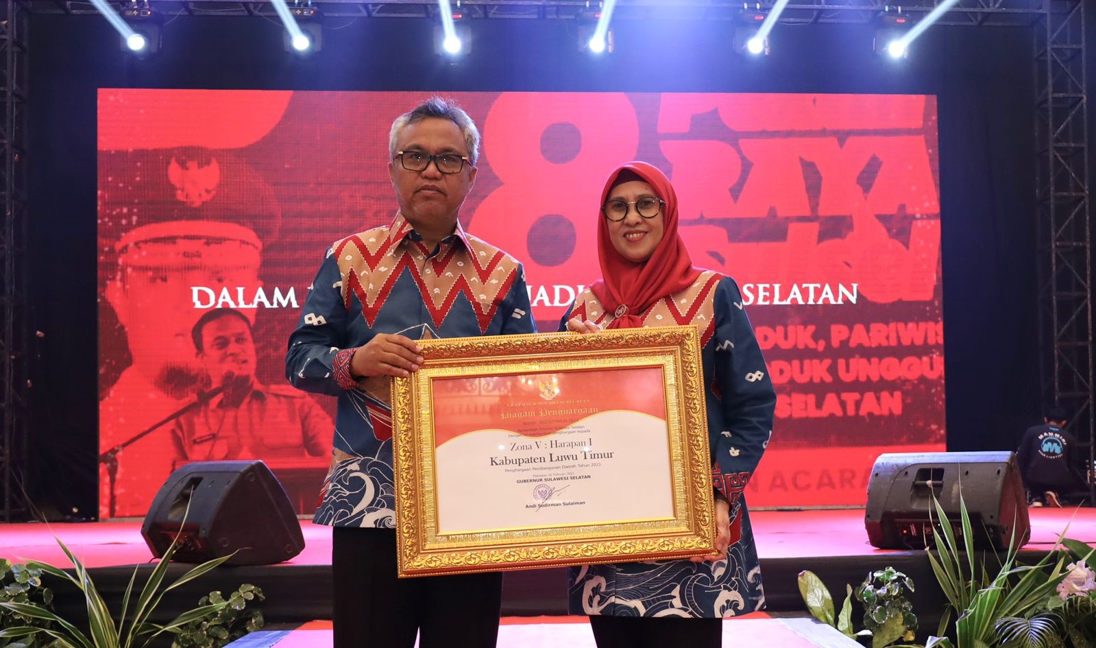 LUWU TIMUR – Bupati Luwu Timur (Lutim), H. Budiman didampingi Ketua Dekranasda, Hj. Sufriaty menghadiri pembukaan Pagelaran Pekan Raya Sulsel yang ke sembilan dalam rangka Hari Jadi Pemerintah Provinsi Sulawesi Selatan (Sulsel) yang ke-354, di Wisma Negara, Center Point of Indonesia di Makassar, Senin (28/8/2023).
