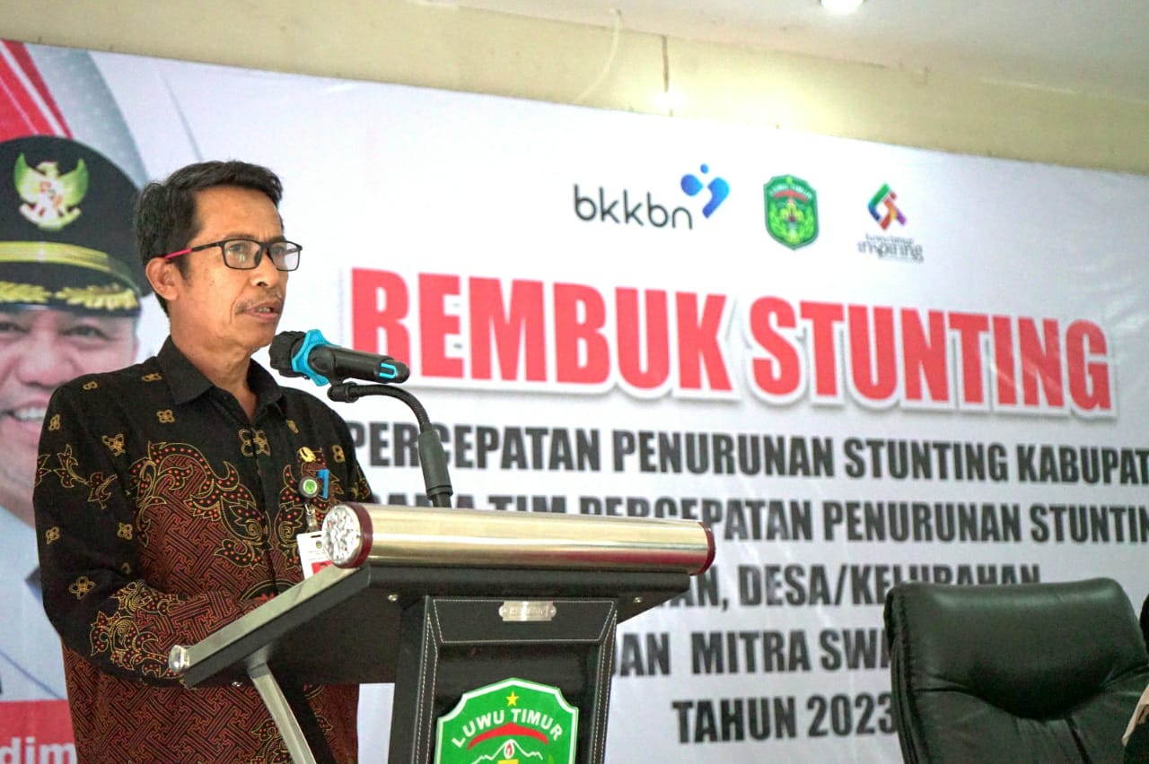 LUWU TIMUR – Staf Ahli Hukum dan Pemerintahan, dr. H. April mewakili Bupati Luwu Timur membuka kegiatan Rembuk Stunting dan Rapat Koordinasi Bersama Tim Percepatan Penurunan Stunting (TPPS) Kabupaten, Kecamatan, Desa/Kelurahan dan Mitra Swasta, di Gedung Wanita Simpursiang Malili, Kamis (07/09/2023).
