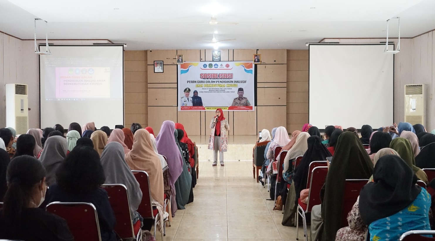LUWU TIMUR – Ketua TP PKK Kabupaten Luwu Timur (Lutim), Hj. Sufriaty Budiman memaparkan pentingnya peran guru dalam pendidikan inklusif Anak Berkebutuhan Khusus (ABK) di Aula Dinas Pendidikan dan kebudayaan (Disdikbud), Jumat (22/09/2023).