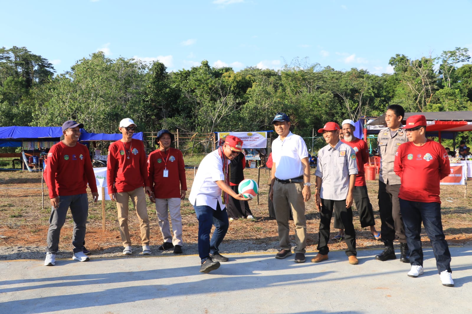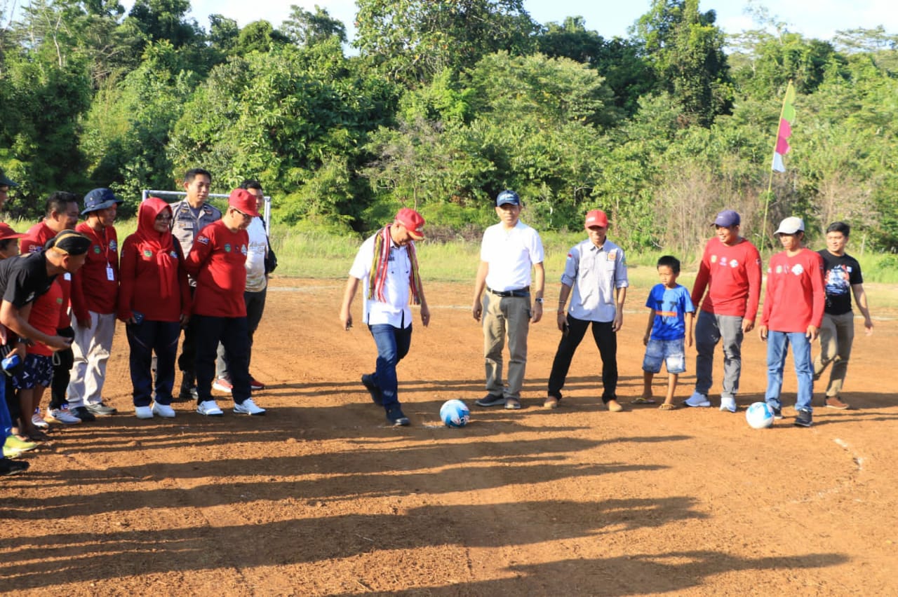 LUWU TIMUR – Pukulan dan Tendangan bola pertama Bupati Luwu Timur, H. Budiman menandai pembukaan Turnamen Bola Volly dan Mini Soccer Lampia Cup I, Ahad (15/10/23).