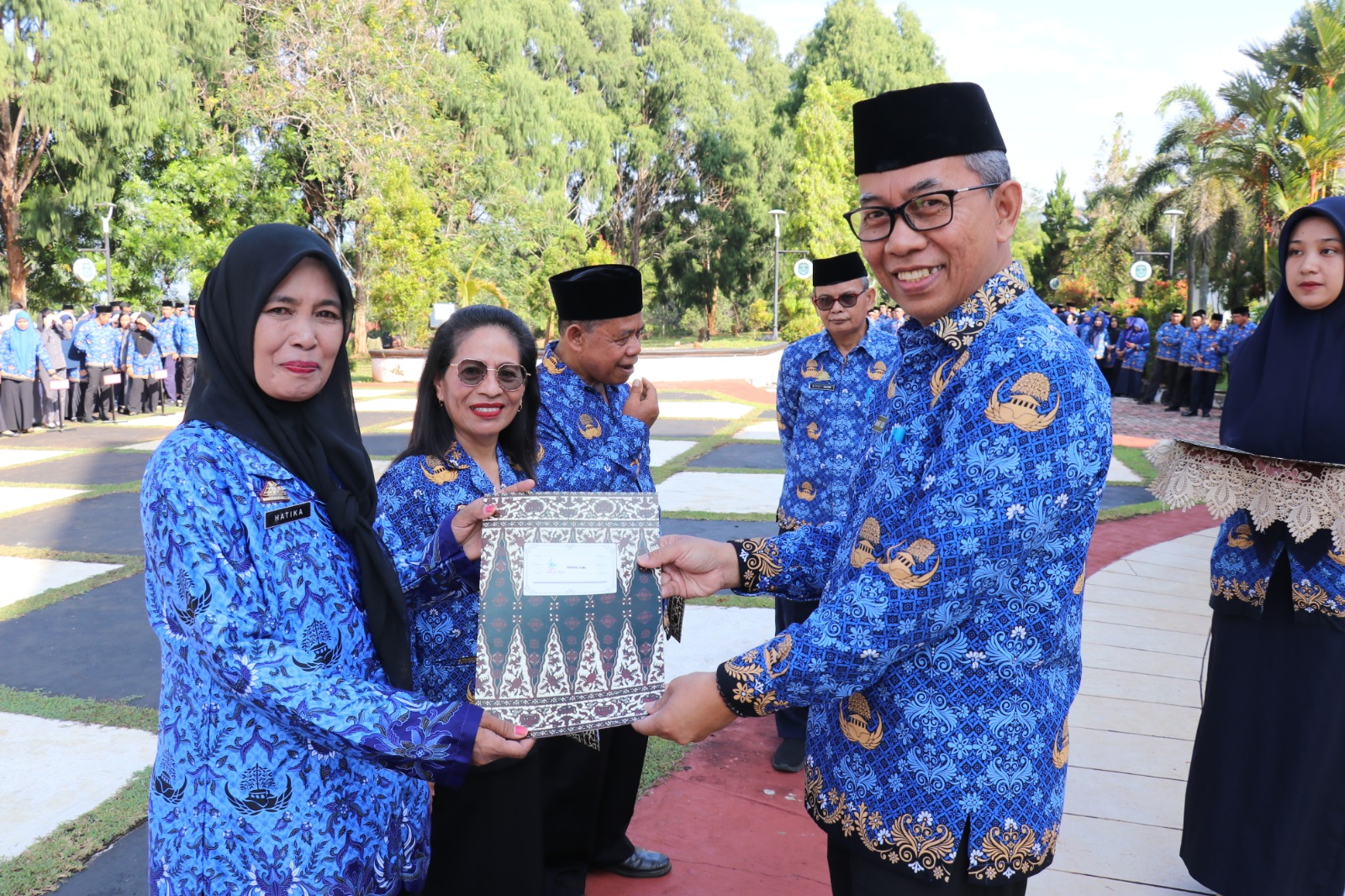 SK Pensiun tersebut diserahkan Sekda Lutim usai memimpin Upacara Hari Kesadaran Nasional (HKN) yang berlangsung di Halaman Kantor Bupati Luwu Timur, Desa Puncak Indah, Kecamatan Malili, Selasa (17/10/2023).