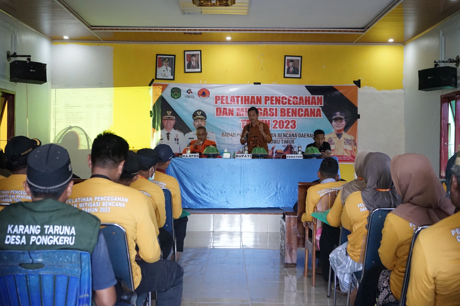 LUWU TIMUR – Staf Ahli Pembangunan Luwu Timur (Lutim), Rapiuddin Tahir mewakili Bupati Lutim, H. Budiman, didampingi Kepala Pelaksana Badan Penanggulangan Bencana Daerah (BPBD), Masdin dan Kepala Desa Pongkeru, Aksan, membuka Pelatihan Pencegahan dan Migitasi Bencana Tahun 2023 yang diselenggarakan BPBD Lutim di Aula Kantor Desa Pongkeru, Kecamatan Malili, Kamis (19/10/2023).