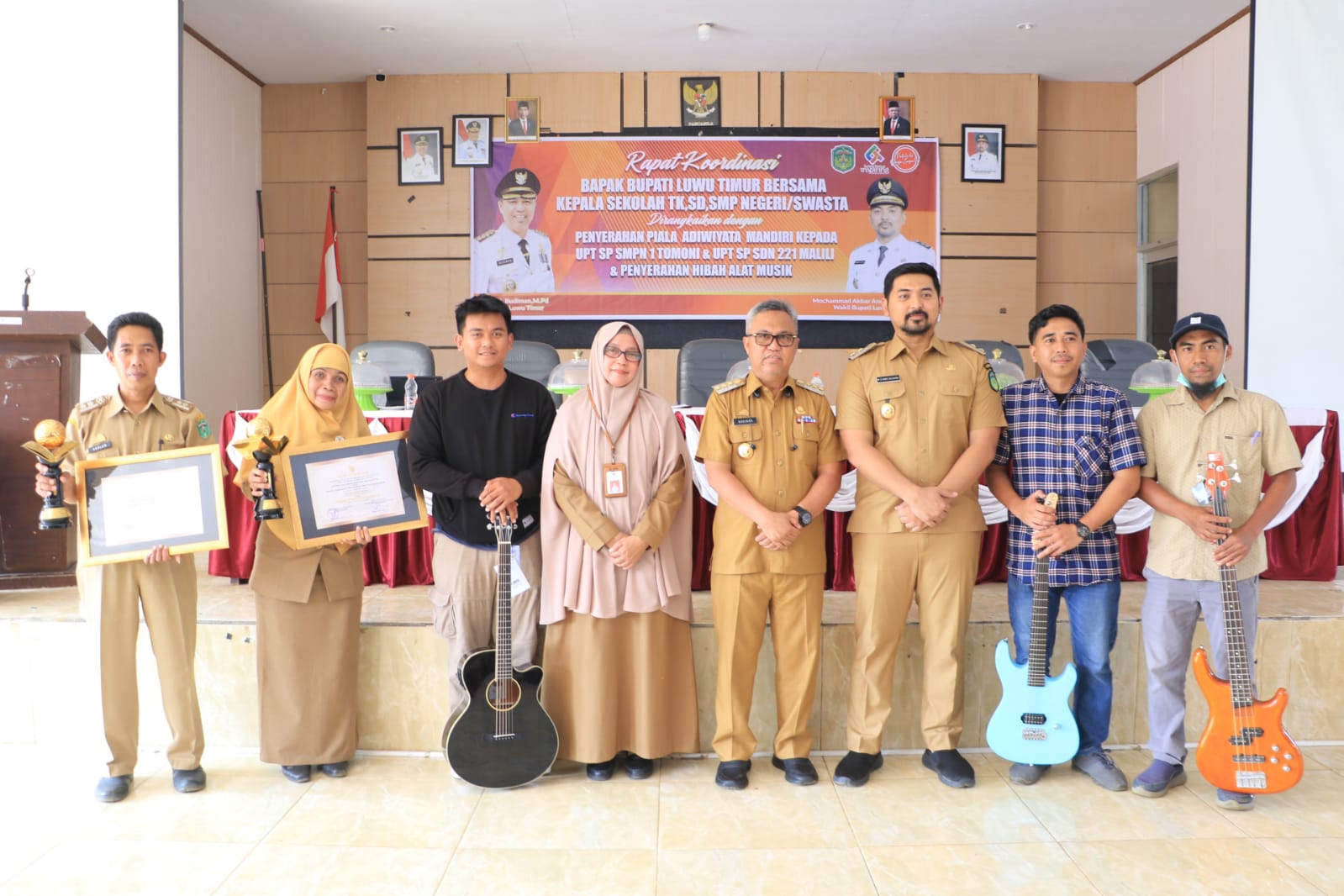 Di sela-sela kegiatan rapat koordinasi dilakukan penyerahan piagam penghargaan kepada sekolah yang meraih Adiwiyata Mandiri 2023 dari Menteri Lingkungan Hidup dan Kehutanan dan Menteri Pendidikan, Kebudayaan, Riset dan Teknologi kepada UPT SMPN 1 Tomoni dan UPT SDN 221 Malili.