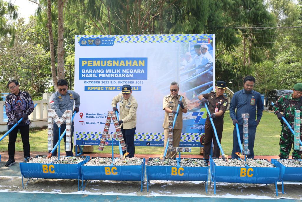 Bea Cukai Malili memusnahkan satu juta delapan puluh enam ribu batang rokok ilegal hasil operasi yang dilaksanakan selama triwulan IV tahun 2023.