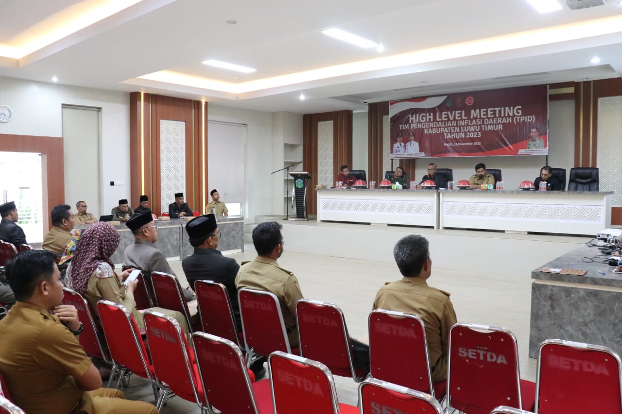 LUWU TIMUR – Bupati Luwu Timur, H. Budiman didampingi Wakil Bupati, Mochammad Akbar A. Leluasa dan unsur Forkopimda Lutim memimpin Rapat High Level Meeting Tim Pengedalian Inflasi Daerah (TPID) Lutim, di Aula Sasana Praja Kantor Bupati, Selasa (19/12/2023).