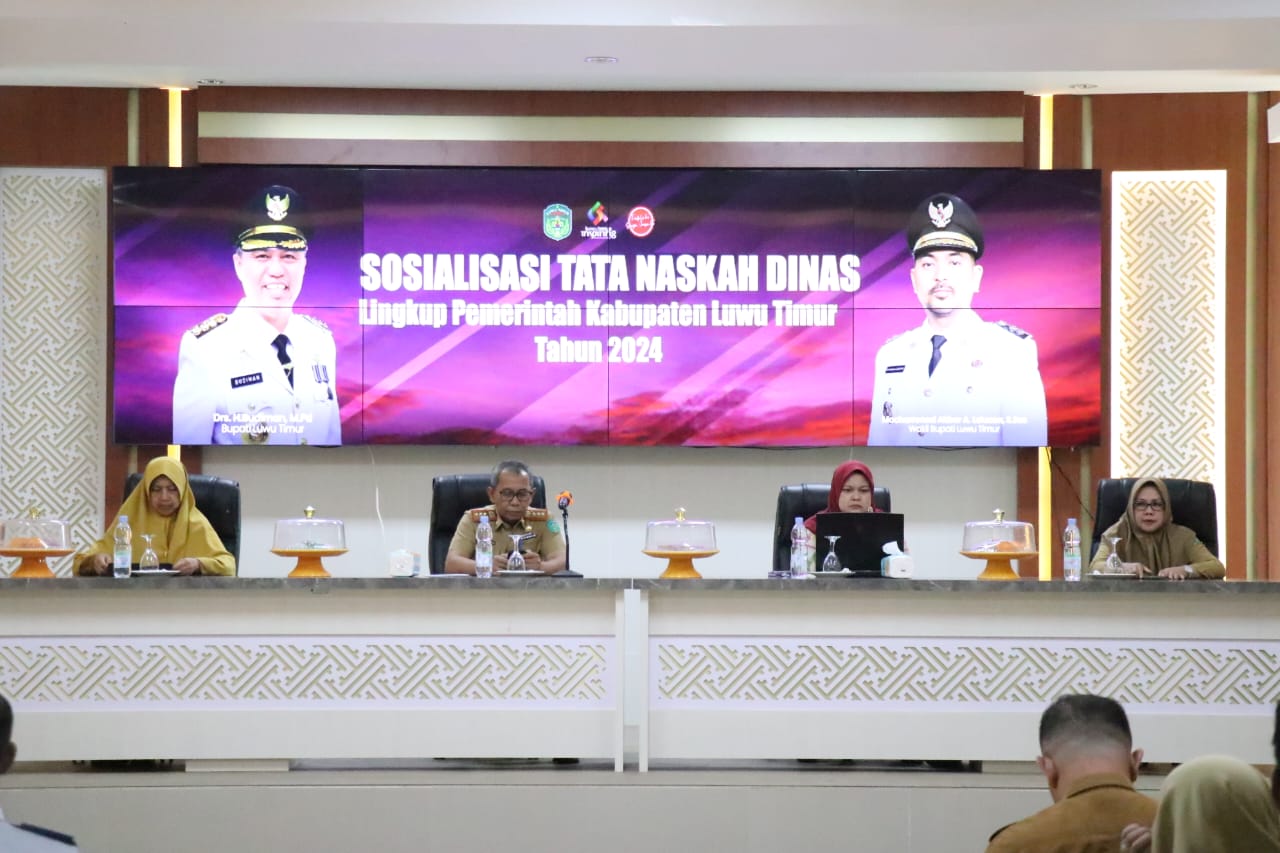 LUWU TIMUR – Pemerintah Kabupaten Luwu Timur melalui Bagian Organisasi Setdakab menggelar Sosialisasi Peraturan Menteri Dalam Negeri (Permendagri) Nomor 1 Tahun 2023 tentang Tata Naskah Dinas di Lingkungan Pemerintah Daerah Kabupaten Lutim, yang berlangsung di Aula Sasana Praja Kantor Bupati, Senin (04/03/2024).