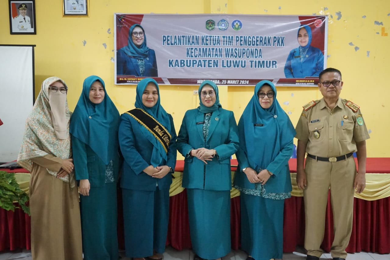 LUWU TIMUR – Ketua Tim Penggerak PKK Kabupaten Luwu Timur, Hj. Sufriaty Budiman mengukuhkan Ketua TP-PKK Kecamatan Wasuponda sekaligus melantik Bunda Literasi yang baru, Helmiati menggantikan Ketua TP PKK yang lama, Vivi Asfirawati, di Aula Kantor Camat Wasuponda, Senin (25/03/2024).