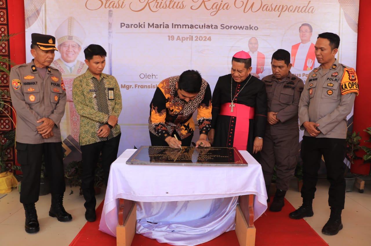 Usai memberikan sambutan, Wakil Bupati Mochmmad Akbar Andi Leluasa bersama Uskup Agung Koajutor Keuskupan Agung Makassar, Mgr. Fransiskus Nipa menandatangani prasasti sebagai tanda peresmian Gereja Katolik Stasi Kristus Raja Wasuponda Paroki Maria Immaculata Sorowako.