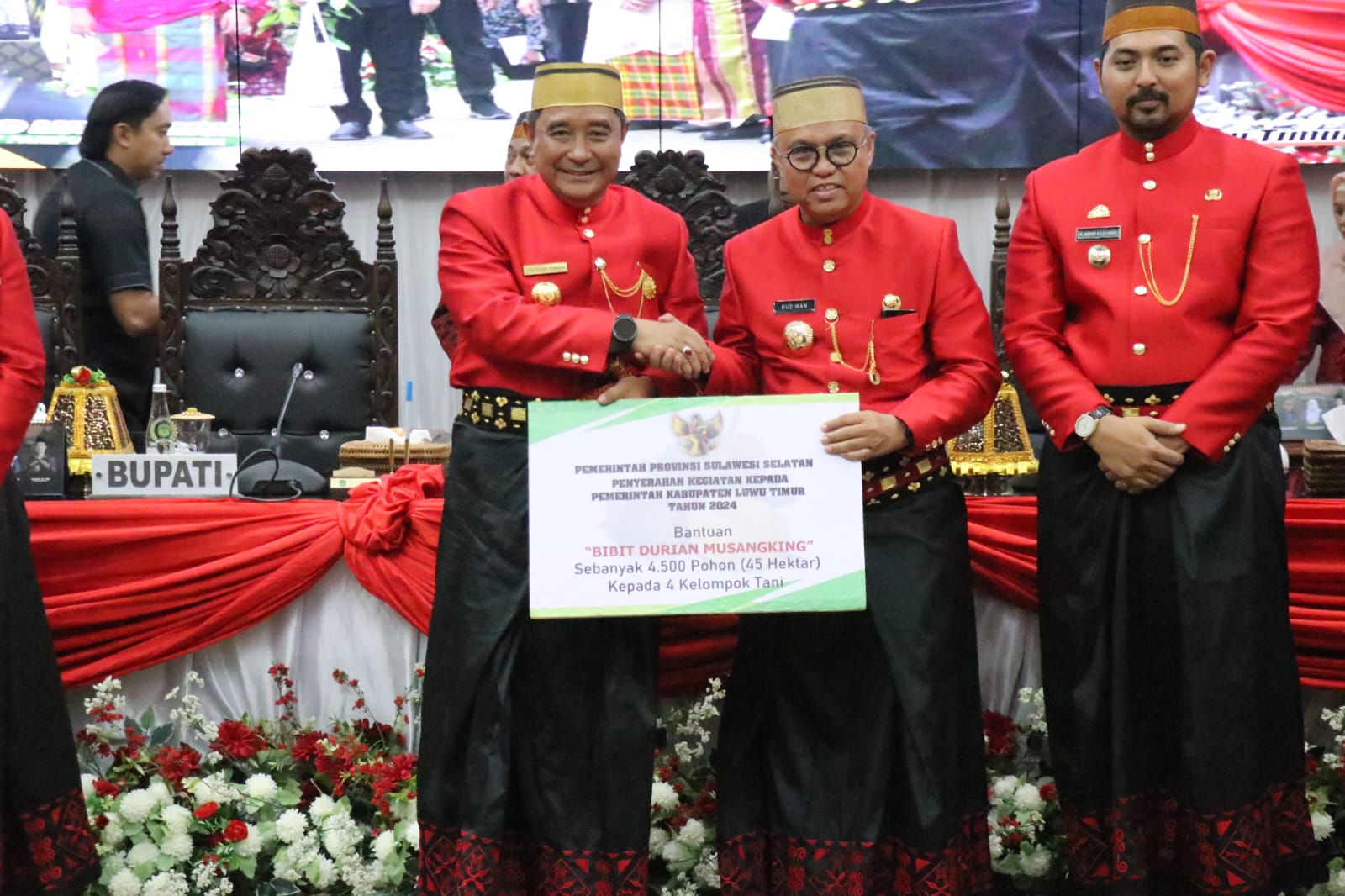 Paripurna HUT Lutim ke 21 ini ditutup dengan berbagai penyerahan bantuan, diantaranya dari Pj. Gubernur kepada Bupati Luwu Timur yakni Dana Bantuan CSR Bank Sulselbar untuk pembangunan Taman Kota dan Trotoar, bantuan rumah ikan 15 lokasi, asuransi nelayan 100 orang, restocking ikan laut 20.000 ekor yang diperuntukkan guna peningkatan produksi perikanan tangkap.