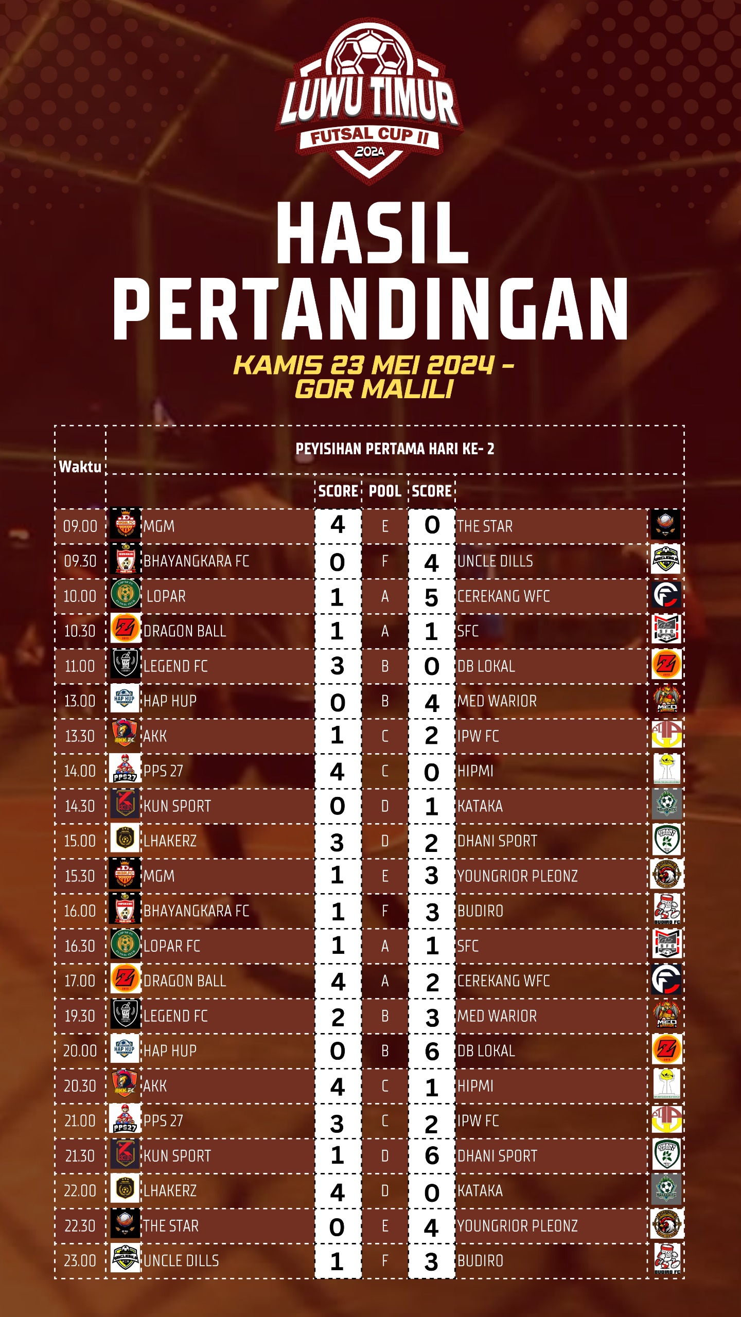 Berikut hasil pertandingan hari kedua :