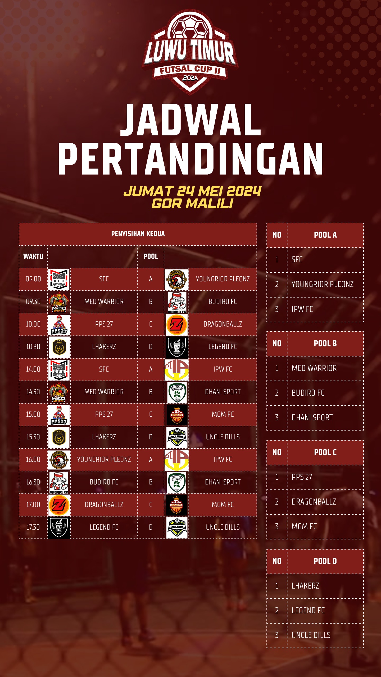 “Terdapat 4 grup, dan masing-masing grup akan diisi 3 klub untuk memperebutkan babak perempat final,” pungkas Khamrul.