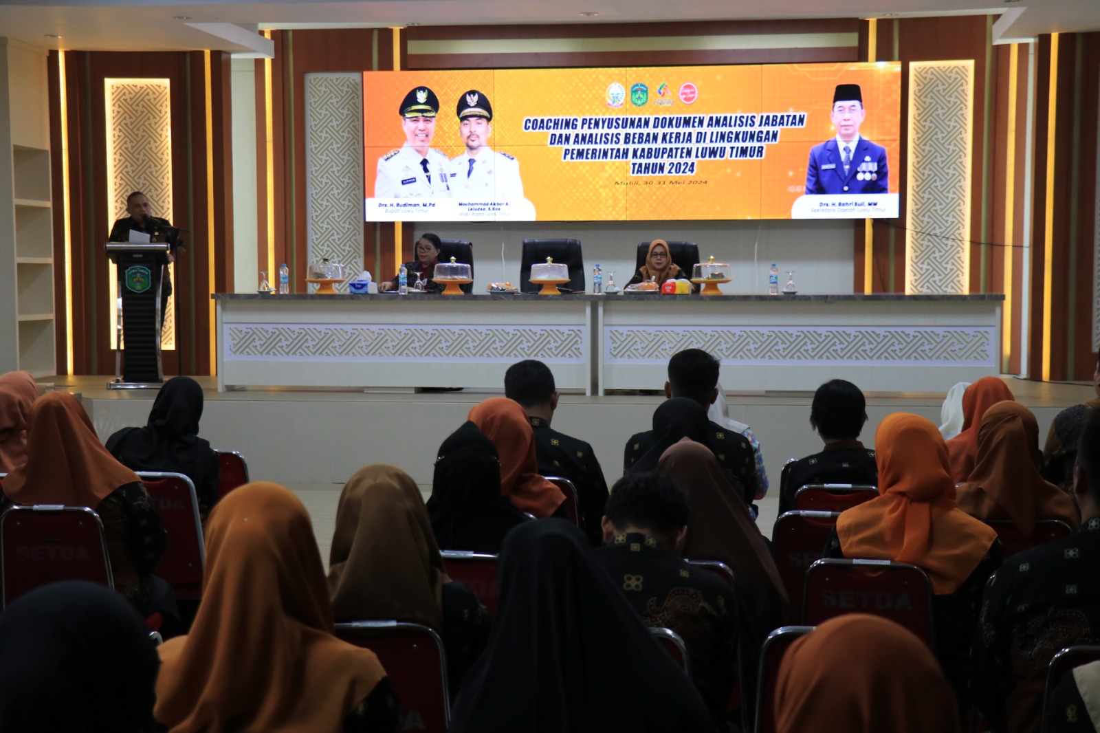 LUWU TIMUR – Asisten Perekonomian dan Pengembangan Infrastruktur (Asisten II), Masdin mewakili Bupati Luwu Timur didampingi Kabag Organisasi, Hj. Andi Asmah Sari membuka Coaching Penyusunan Dokumen Analisis Jabatan (Anjab) dan Analisis Beban Kerja (ABK) di lingkungan Pemerintah Kabupatan Luwu Timur Tahun 2024.