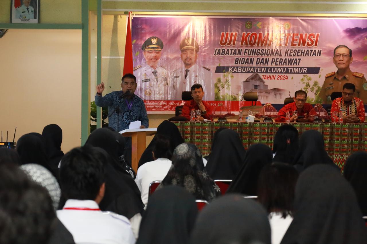 LUWU TIMUR – Staf Ahli Hukum dan Pemerintahan, Andi Juana Fachruddin Membuka Kegiatan Uji Kompetensi Jabatan Fungsional Kesehatan Bidan dan Perawat, yang dilaksanakan di Hotel I Lagaligo Kecamatan Malili, Jum’at (31/05/2024).