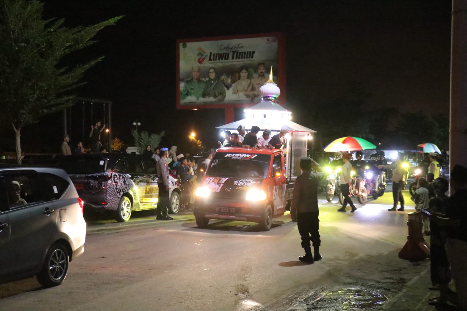 Pelepasan peserta Takbir keliling se-Kecamatan Malili ditandai dengan pengangkatan Bendera Start oleh Kapolres Luwu Timur, AKBP. Zulkarnain, dan dihadiri unsur Forkopimda Lutim, Sekda Lutim, H. Bahri Suli beserta jajaran Pemkab Lutim, dan para Panitia.