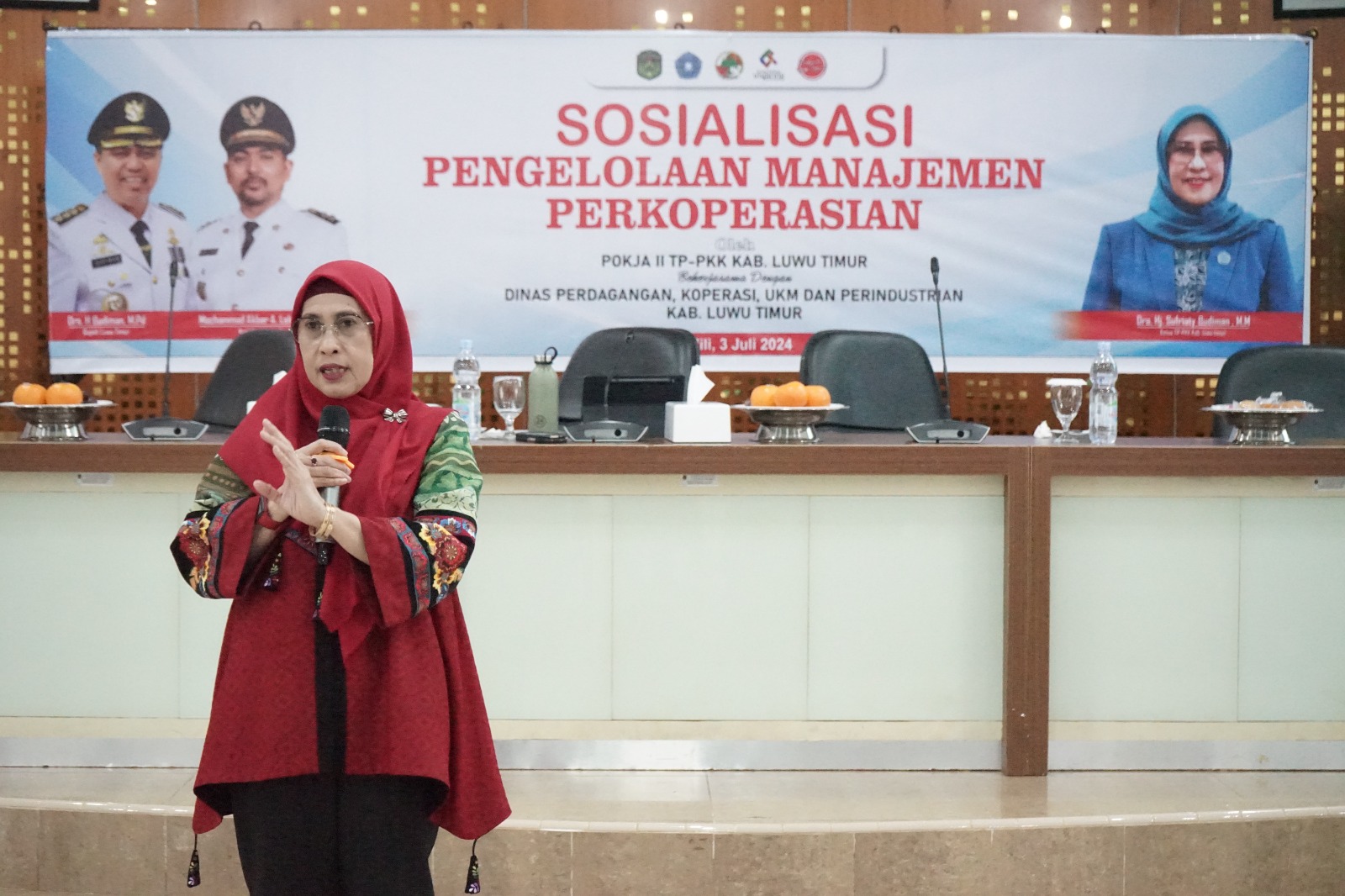 LUWU TIMUR – Ketua TP PKK Luwu Timur, Hj. Sufriaty Budiman mengajak pengurus TP PKK terlibat aktif dalam mendukung pengembangan koperasi di wilayah Lutim. Hal tersebut ia sampaikan saat membuka sekaligus menjadi narasumber pada kegiatan Sosialisasi Pengelolaan Manajemen Perkoperasian di Aula Rujab Bupati Lutim, Rabu (03/07/2024).