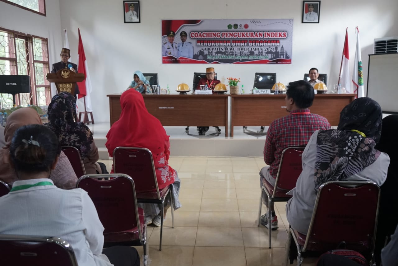 LUWU TIMUR – Pemerintah Kabupaten Luwu Timur melalui Badan Kesatuan Bangsa dan Politik (Kesbangpol) bekerjasama dengan Balai Litbang Agama Makassar menggelar Coaching Pengukuran Indeks Kerukunan Umat Beragama Tahun 2024, di Aula Kesbangpol, Rabu (10/07/2024).