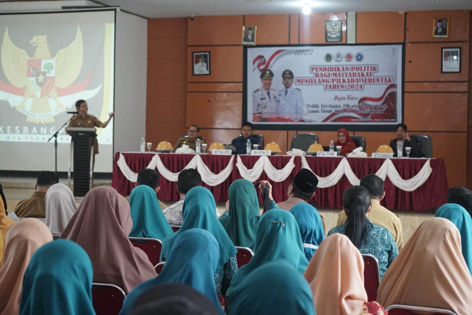 LUWU TIMUR – Pemerintah Kabupaten Luwu Timur (Pemkab Lutim) melalui Kesatuan Bangsa dan Politik (Kesbangpol) menggelar Sosialisasi Pendidikan Politik bagi Masyarakat Menjelang Pilkada Serentak tahun 2024 bertema “Politik Berdaulat, Pilkada Bermartabat, Luwu Timur Maju dan Berkelanjutan”, di Aula Dinas Pendidikan dan Kebudayaan, Selasa (16/07/24).