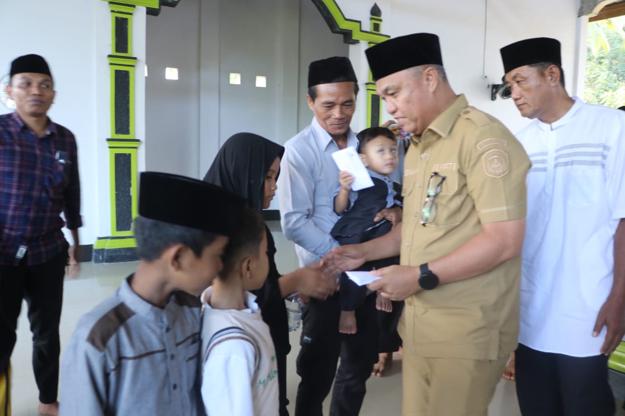 LUWU TIMUR – Bupati Luwu Timur, H. Budiman memberikan santunan kepada anak yatim saat Silaturahmi, Dzikir, dan Doa bersama anak yatim di Pondok Pesantren Uswatun Hasanah, Desa Cendana Hijau, Kecamatan Wotu, Selasa (16/07/24).