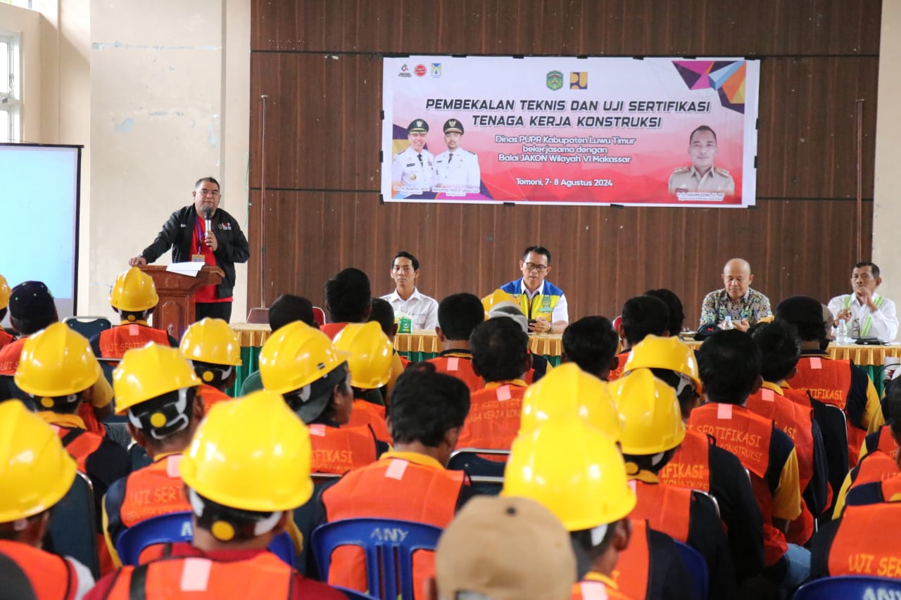 LUWU TIMUR – Staf Ahli Hukum dan Pemerintahan, Andi Juanna Fachruddin mewakili Bupati Luwu Timur membuka kegiatan Pembekalan Teknis dan Uji Sertifikasi Tenaga Kerja Konstruksi (TKK) di Gedung Serbaguna Kantor Camat Tomoni, Rabu (07/08/2024).