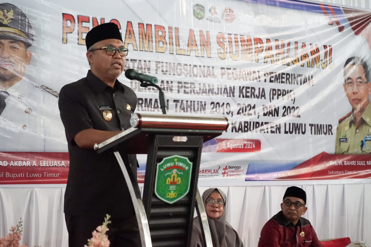 Ajakan tersebut disampaikannya saat menyerahkan secara simbolis Perjanjian Kerja Pegawai Pemerintah dengan Perjanjian Kerja (PPPK) dirangkaikan dengan Pengambilan Sumpah Janji Jabatan Fungsional PPPK Formasi tahun 2019, 2021 dan 2022 lingkup Pemerintah Kabupaten Luwu Timur, di Gedung Olahraga, Malili, Jum’at (09/08/2024).