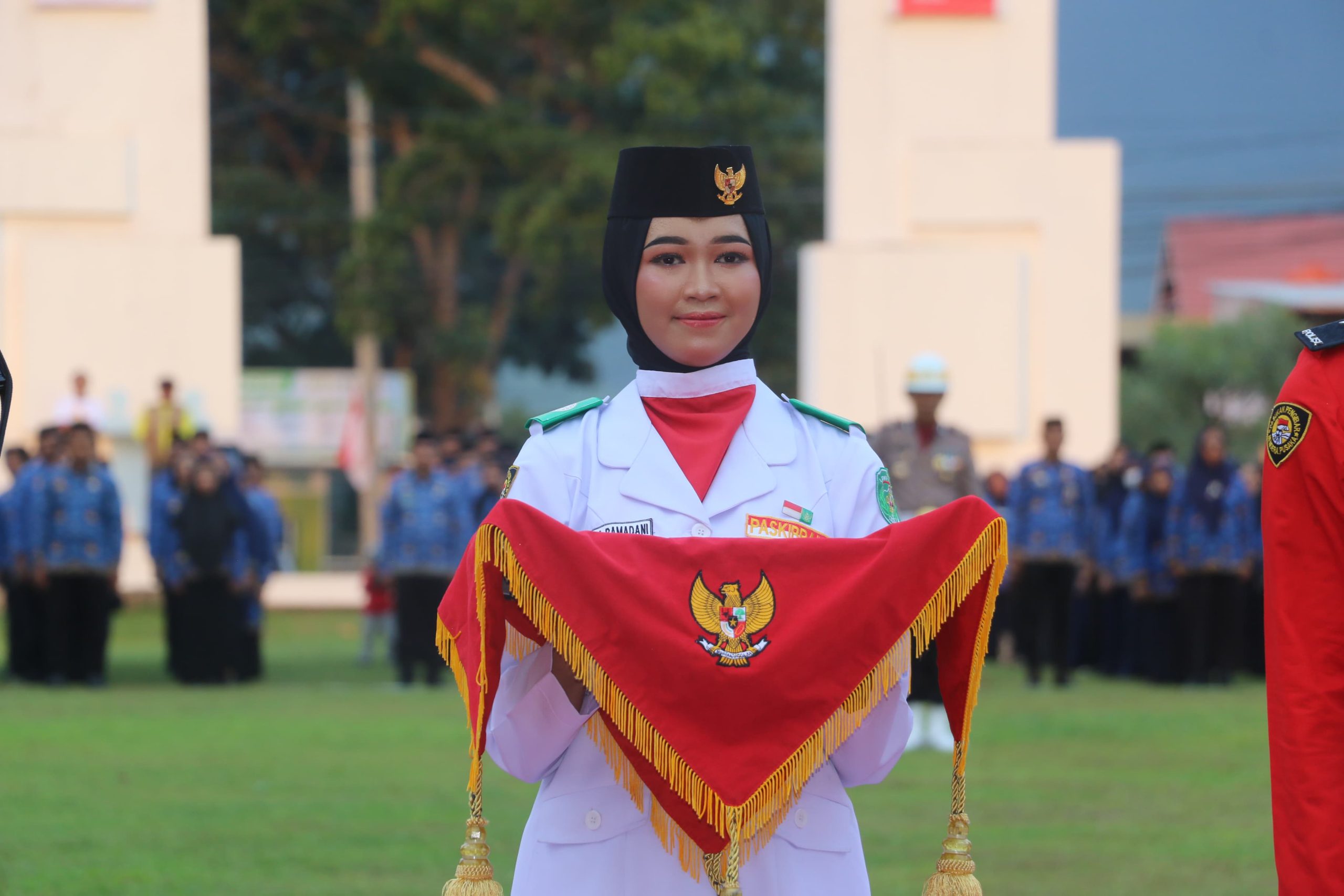 LUWU TIMUR – Qaila Aulia Ramadhani, siswa Kelas 12 SMAN 2 Luwu Timur didapuk menjadi pembawa baki pada Upacara Penurunan Bendera Sang Merah Putih dalam rangka HUT Republik Indonesia ke-79 tingkat Kabupaten Luwu Timur.
