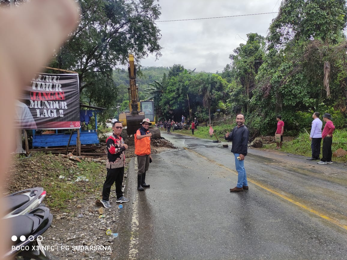 Namun begitu, arus kendaraan tetap berjalan lancar karena tim bersama TNI/Polri, Camat Angkona dan aparat desa bergerak cepat membersihkan material yang menutup sebagian jalan utama.