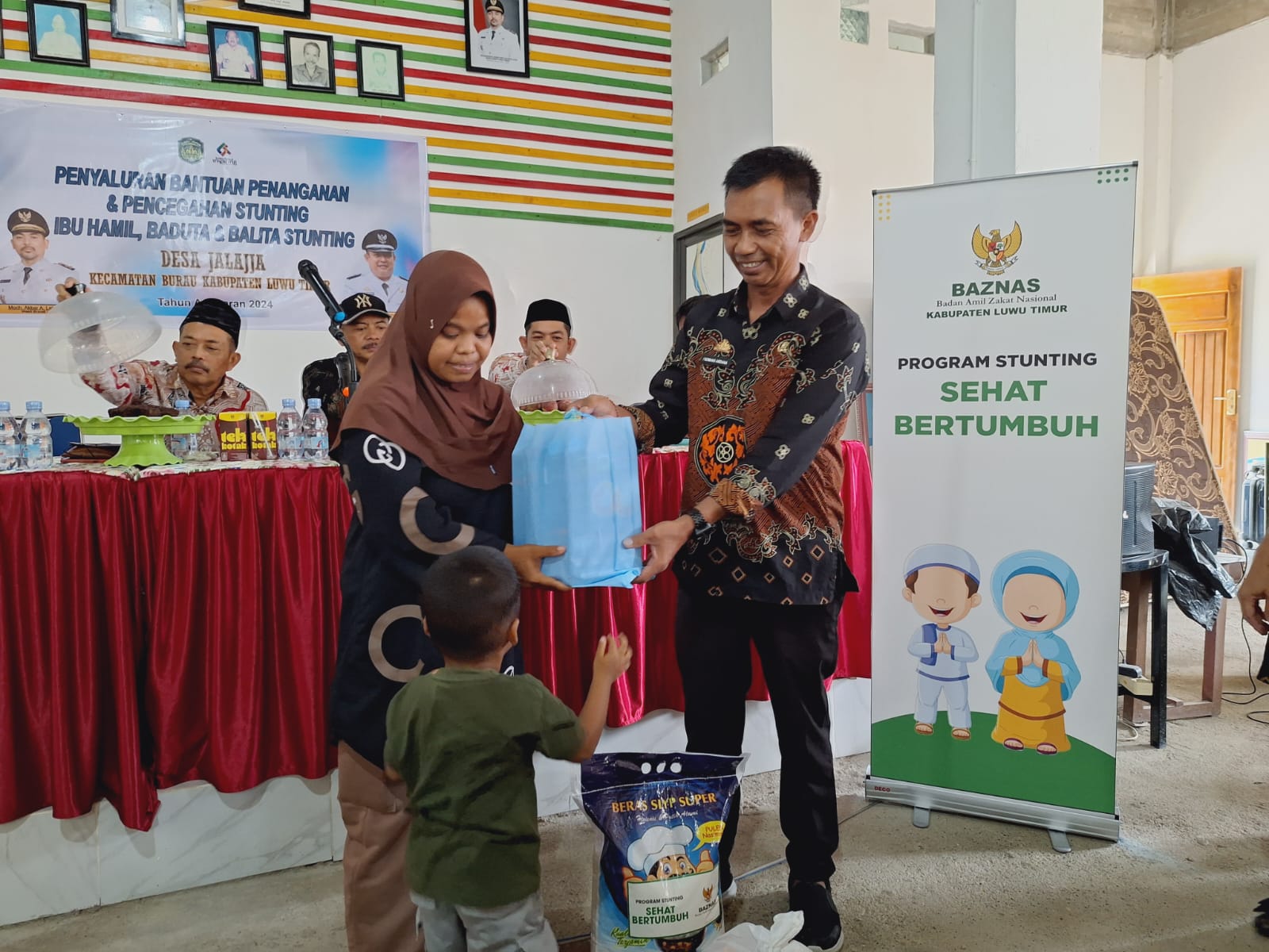 LUWU TIMUR – Guna mewujudkan masyarakat yang sehat dan sejahtera, Pemerintah Kecamatan Burau, Desa Jalajja berkolaborasi Badan Amil Zakat Nasional (BAZNAS) dan PKM Burau, menyerahkan bantuan penanganan stunting kepada Ibu Hamil, Baduta dan Ibu Stunting, berupa pemberian makanan tambahan (PMT) dari pangan lokal,di Kantor Desa Jalajja, Kamis (19/12/2024).