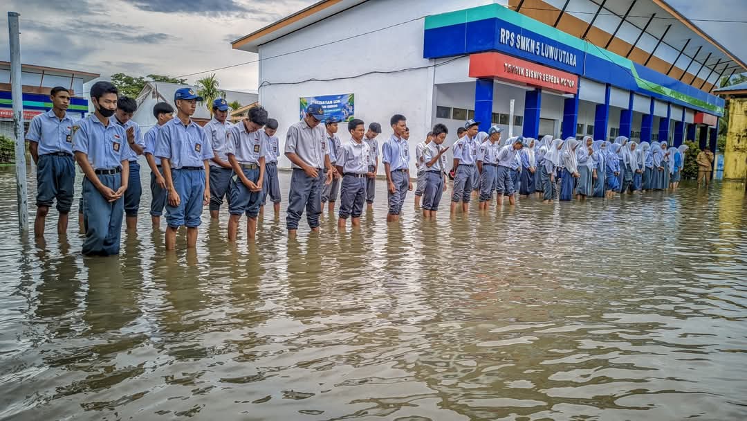Sebuah potret upacara bendera di SMKN 5 Luwu Utara yang digelar di tengah genangan banjir viral di media sosial dan menuai beragam tanggapan dari warganet.