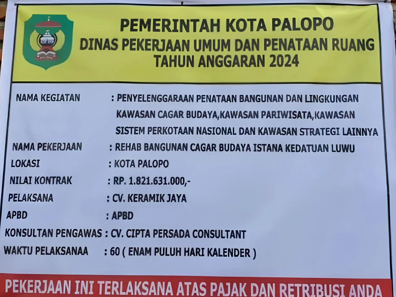 Proyek rehabilitasi cagar budaya Istana Kedatuan Luwu di Kota Palopo menuai sorotan. Pemangku adat Kedatuan Luwu, Maddika Bua Andi Syaifuddin Kaddiraja, mempertanyakan pelaksanaan proyek senilai Rp1,8 miliar yang menurutnya melenceng dari rencana awal.